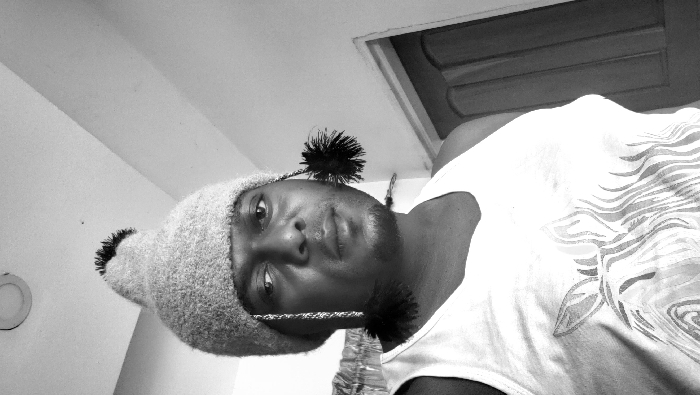 An indoor, black and white, close-up photograph captures an adult male from the chest up, facing forward. The individual has dark skin and a short beard. He wears a light-toned, textured beanie hat with a prominent pom-pom on the crown and two smaller pom-poms suspended by cords at ear level. He is dressed in a light-colored tank top featuring a graphic design of a zebra's head and striped neck on the front. The background consists of plain, light-colored walls. A recessed circular light fixture is visible on the ceiling. To the left, a portion of a curtain or hanging fabric is discernible. To the right, a dark wooden door or door frame is partially visible. The scene is located in Sabon Tasha, Nigeria.