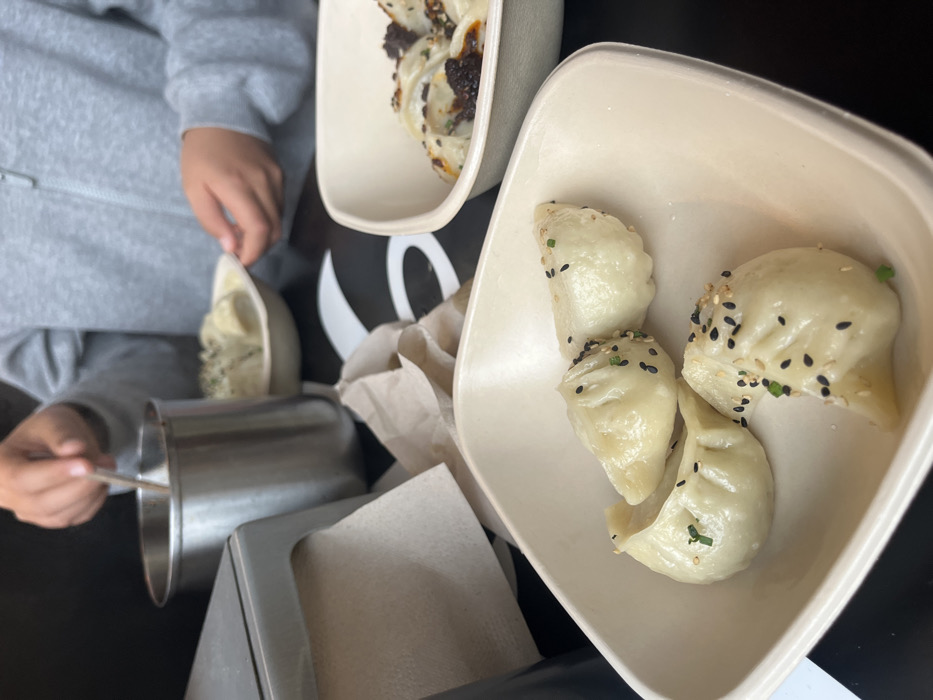 The image depicts an indoor dining scene at a casual restaurant, specifically Gyoza Bar in Zurich, Switzerland. The environment features a dark, possibly black, tabletop with a large, stylized white "G" graphic partially visible. In the foreground, a cream-colored, square, disposable fiber bowl contains four light-skinned dumplings, likely gyoza or potstickers. These dumplings are garnished with black sesame seeds and small green chives. To the right, another identical cream-colored, square, disposable fiber bowl holds more dumplings, which are coated with a dark, reddish-brown chili oil or sauce and also garnished with sesame seeds. In the background, a person wearing a grey zippered hooded sweatshirt is partially visible. Their right hand is holding a slender wooden utensil (possibly a chopstick or small spoon) within a silver-colored metal cylindrical container, likely stirring a sauce or condiment. Their left hand is resting near the bowl of chili-oil-topped dumplings. Additional objects on the table include a grey rectangular item on the far left, possibly a napkin dispenser, and crumpled brown paper napkins alongside a stack of white paper napkins. The scene indicates a meal service focusing on Asian-style dumplings in an informal setting.