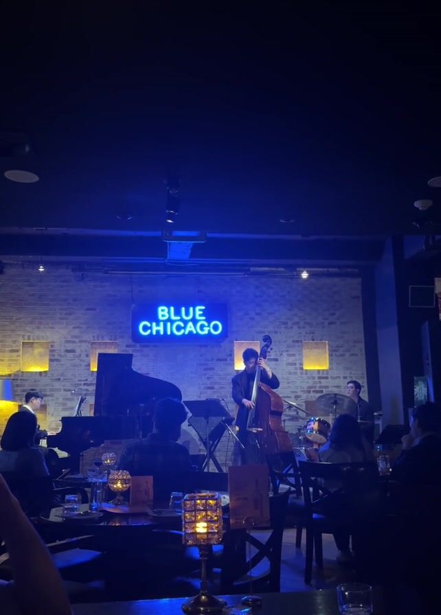 dimly lit jazz club called "Blue Chicago"