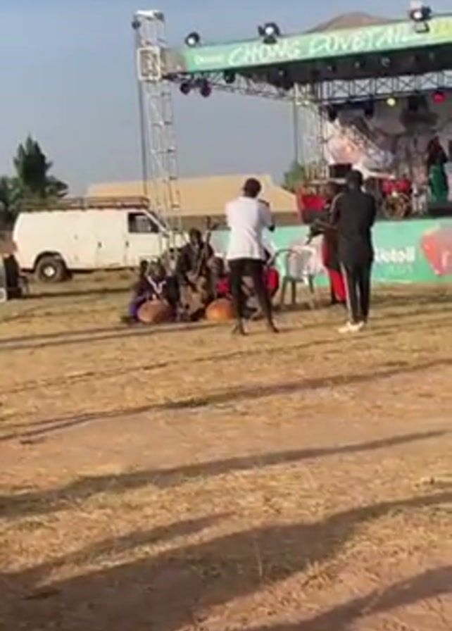 group of people performing on a dry, grassy field with a stage in the background. The stage is decorated with a banner that reads "Chong Dovetail 2023." On the left of the scene, a white van is parked. In the center, several men are sitting and playing gourd-like instruments. A man in a white shirt and black pants is dancing in front of them. Another man in a black suit is standing nearby, seemingly directing the performance. A woman in a white shirt, green skirt with red trim, and ankle bracelets enters the scene and begins to dance. The sky is clear and blue.
