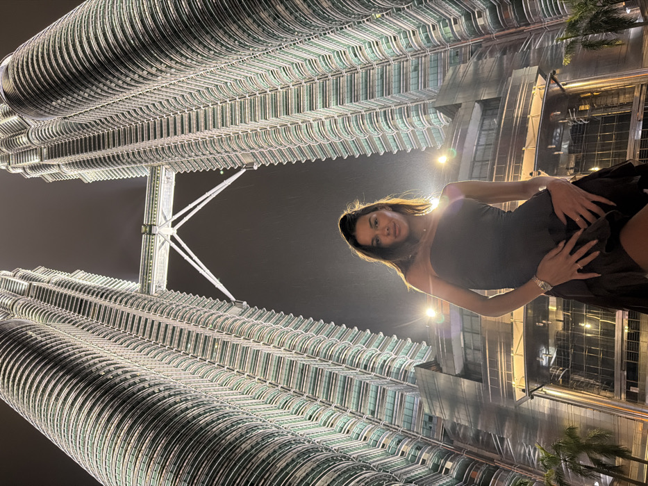 A nighttime, low-angle photograph captures a young adult female posing in front of the illuminated Petronas Twin Towers in Kuala Lumpur, Malaysia