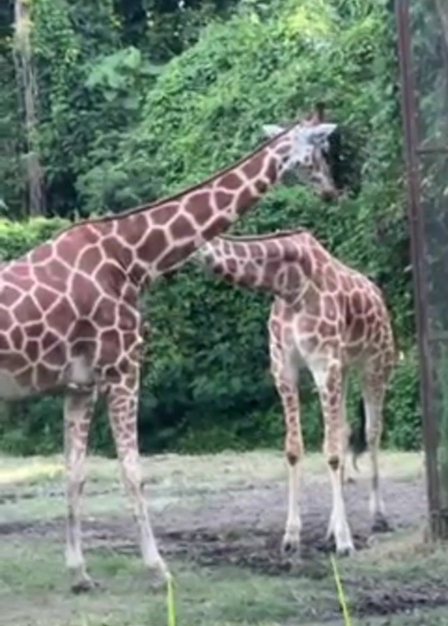 two giraffes in an outdoor enclosure with green foliage in the background. The giraffes are both brown and white with patterned spots. The taller giraffe leans its head and neck onto the head and neck of the shorter giraffe. The ground is a mix of green grass and patches of mud. A metallic fence is on the right side of the frame. Audio includes the sound of a woman's voice.