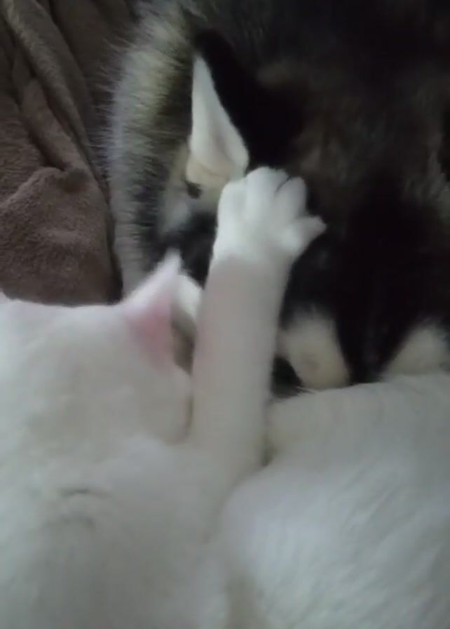 A white cat is lying down with its paws on the face of a dog with gray and black fur