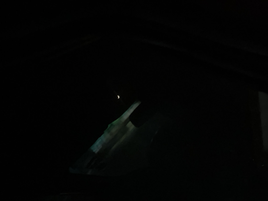 A sliver of a crescent moon is visible in the upper left corner of the frame, against an otherwise dark sky. The foreground is dominated by the interior of a vehicle, seen at night. The light from the moon reflects subtly on the dashboard and windshield, giving a vague suggestion of texture and shape. The car's ceiling is barely visible at the top of the image.
