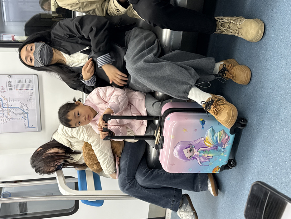 Inside a subway car in Tiaodeng, China, four individuals of Asian ethnicity are seated along a black-padded bench. From left to right: An adult female, with dark hair and glasses, wearing a white quilted jacket over a dark top and blue jeans, is positioned leaning forward, holding a light brown furry object and a white smartphone. Her silver-colored shoes are visible. Adjacent to her, a young girl, wearing a pink quilted jacket and grey pants, sits atop a pink rolling suitcase featuring a mermaid graphic. She holds the suitcase's black retractable handle and looks directly towards the viewer with a neutral expression. To her right, an adult female, wearing a grey face mask, a black jacket over a white and blue striped long-sleeved shirt, and grey sweatpants, is seated, facing slightly right. She wears white socks and brown chunky-soled shoes. On the far right, partially visible, is another individual wearing a beige jacket and light brown boots. A subway map with Chinese characters and line diagrams is affixed to the white wall above the seating. The floor is light blue.