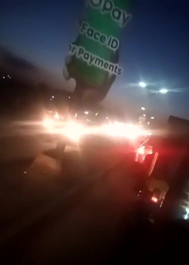 The video appears to be filmed from a moving vehicle, possibly a motorcycle, at night. The scene is dominated by bright headlights from oncoming traffic, causing significant glare. A green sign with "OPay" and "Face ID for Payments" printed on it is visible, seemingly held up by someone. The background shows a road and other vehicles with red taillights. The video becomes shaky and blurry due to the movement.