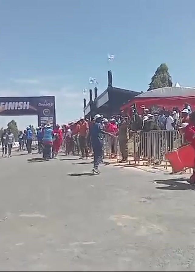 finish line of a race. A man sits on a bench in the foreground, facing the finish line. A banner saying "FINISH" is visible above the track. A group of race participants are walking towards the finish line. Medical personnel in red uniforms are carrying a stretcher with someone on it towards the side of the track. Crowds of people stand behind metal barriers on either side of the track, watching the race. There are white tents on one side of the track. Flags are visible flying in the background. The sky is clear and blue.
