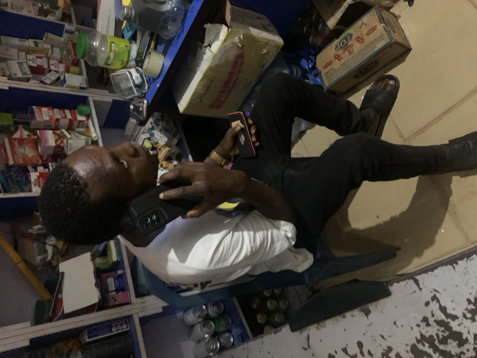 A man sits in a cluttered room, talking on a black smartphone. He wears a white t-shirt, black jeans, and dark sandals. In his other hand, he holds an orange phone. Shelves filled with various items surround him, including boxes and packaged goods. Cans are visible under the chair. The room's lighting is dim, and the floor has a tile pattern.