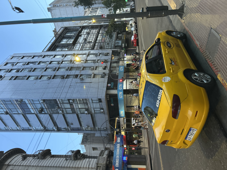 A yellow taxi cab is parked on the sidewalk in front of a tall building. The building has several windows, and is topped with an elaborate cornice. Several GTN signs, inadi signs, and retail shops, including a GEO store, line the street. Pedestrians are walking on the sidewalk. The license plate of the taxi reads AA 765 YB. A telephone number of 455-5555 is visible on the rear of the car.