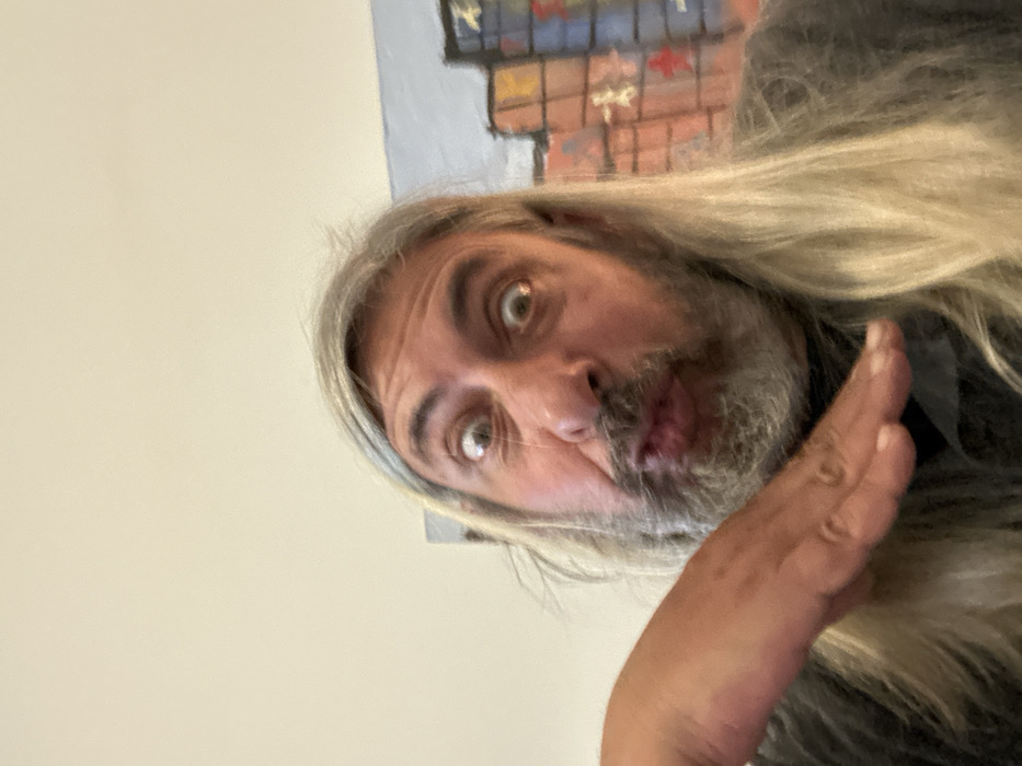 A male individual is depicted in a close-up, head-and-shoulders portrait against an indoor background. He possesses long, straight, light gray hair extending past his shoulders and a matching gray beard. His face displays an exaggerated expression, characterized by wide-open eyes with visible pupils and tightly pursed lips forming a small "O" shape. His left hand is raised to chest height, palm down and slightly angled, positioned in the lower-left quadrant of the frame. He is wearing a dark-colored shirt. The background consists primarily of a plain, light-colored wall. A segment of an abstract painting, featuring block-like structures in various colors (red, brown, yellow) against a light blue background, is visible on the right side of the frame. The scene is situated in Beit Yitshak Sha'ar Hefer, Israel.