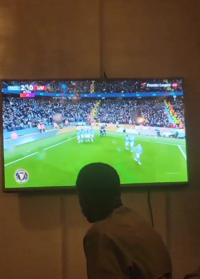 A person is sitting in a chair and watching a soccer game on television. The game is between Manchester City and Liverpool, and the score is 2-0 in favor of Manchester City. The person is watching Manchester City players celebrating a goal. The room appears to be a common area of some kind.