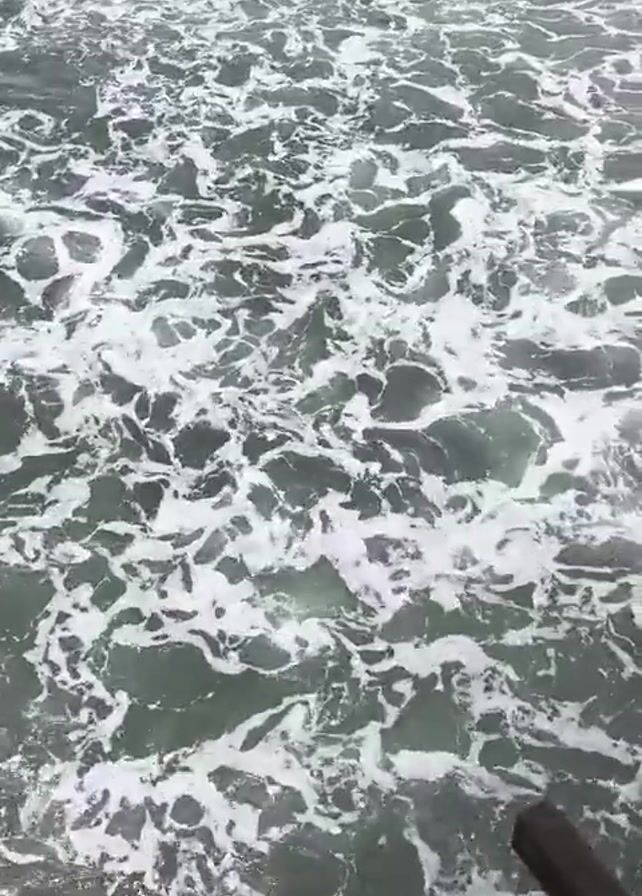 From a high vantage point, the video shows ocean water. The water is a greenish grey color and foamy, with white patches scattered throughout. A dark, round wooden post is visible in the lower right corner of the frame. A wave flows from top right toward the bottom left.