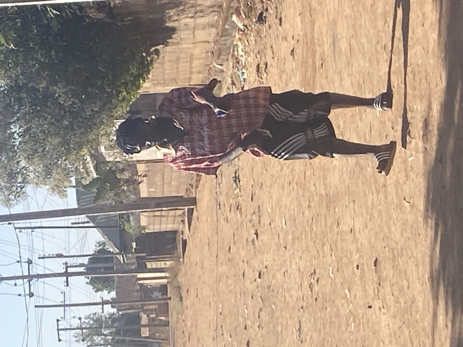The image depicts an unpaved dirt road in Udu, Nigeria, under bright daylight conditions. A dark-complexioned male subject, with dreadlocked hair, stands near the center of the frame, facing slightly to the viewer's right. He wears a red and white plaid short-sleeved shirt over a yellow undershirt, black athletic shorts with prominent white stripes on the sides, and white Adidas slide sandals. His left hand is lowered, holding a dark, rectangular object, possibly a mobile phone. His right arm is bent at the elbow. His left foot is partially lifted from the ground, suggesting motion. The environment includes a dusty, reddish-brown dirt road that recedes into the background. Along the left side of the road, multiple wooden utility poles with numerous tangled overhead wires are visible. Beyond these poles, various single-story structures, including buildings with corrugated metal roofs and rough-hewn walls, line the street. A distant figure in a white shirt is partially visible further down the road on the left. On the right side of the frame, a block wall runs parallel to the road, with sparse vegetation, including a large leafy tree, behind it. Scattered debris and refuse are visible along the edge of the road on the right. Strong shadows from the subject and overhead objects are cast on the ground.