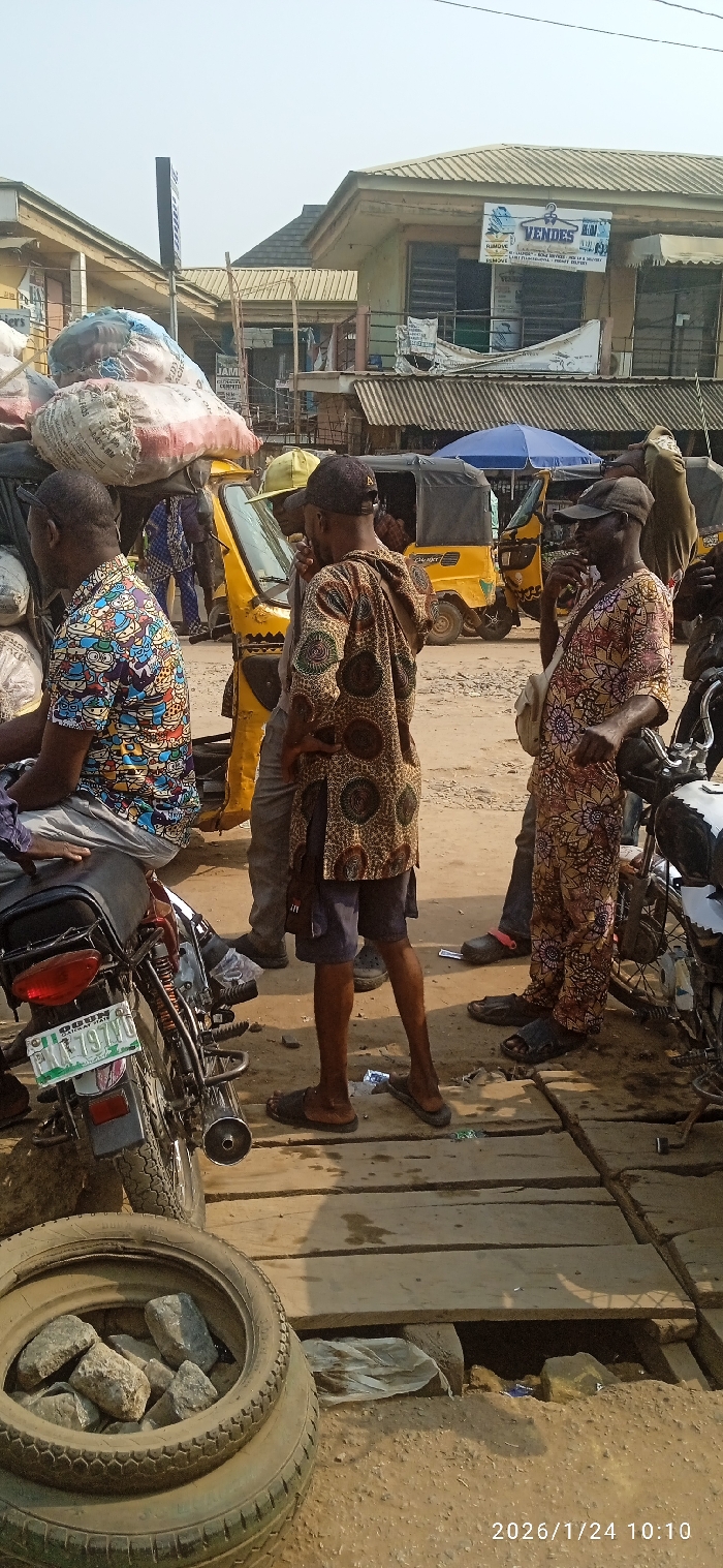 The image depicts a bustling outdoor street market scene in Lagos, Nigeria, captured on January 24, 2026, at 10:10 AM, under bright daylight conditions. In the foreground, a black motorcycle is parked on the left, loaded with several large sacks. The motorcycle displays an Ogun State, Nigeria license plate, "OGUN 779YU." Seated on the motorcycle is an adult male, visible from the back, wearing a multi-colored patterned short-sleeve shirt and light-colored trousers. To his right, two discarded tires are stacked, the upper one containing several rocks. A makeshift wooden walkway, constructed from parallel planks, spans a small depression in the unpaved, dusty ground. Litter, including plastic wrappers, is scattered across the ground. Several other adult males are present in the mid-ground. One man stands center-left, facing right, wearing a dark baseball cap, a brown patterned long-sleeve top, dark shorts, and dark sandals. Another man, wearing a yellow baseball cap, stands to his left, facing him. To the right, a third man with a dark baseball cap and a light-colored shoulder bag wears a patterned short-sleeve shirt and dark trousers, leaning near another parked motorcycle (partially visible). Further back, additional individuals are visible, including one in blue patterned attire near a yellow tricycle. The scene is populated by multiple yellow tricycles (keke napep), characteristic commercial transport vehicles in Nigerian cities. One tricycle in the mid-ground is laden with sacks, similar to the foreground motorcycle. In the background, two-story buildings with corrugated metal roofs line the street. One building features a visible sign for "VENDES" with a clothes hanger icon, indicating a retail business, and another sign with "JAMI." A blue umbrella is open in the distance. The overall environment is unpaved, appears busy, and exhibits elements typical of an active urban market.