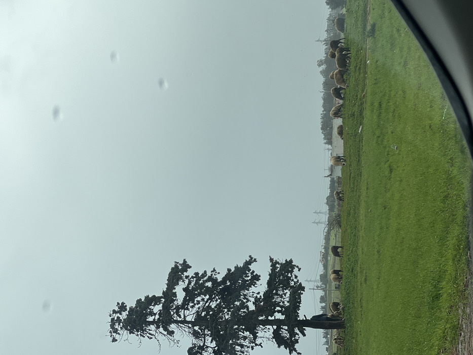 A large silhouette of a tree dominates the foreground against a gray, overcast sky. Raindrops are visible on a window. A field of green stretches into the distance where a flock of sheep graze. Utility poles are sparsely visible along the field. Part of a car interior frames the right edge of the image.
