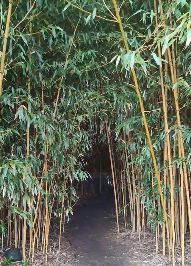 pathway through a bamboo forest. The path is narrow and dark, surrounded by tall, golden bamboo stalks with green leaves. The scene is well-lit, with daylight filtering through the bamboo canopy. At the beginning of the video, a voice can be heard saying, "Let's go in the bamboo forest."