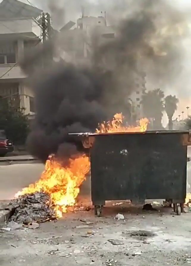 dumpster fire on a street with apartment buildings in the background. Large flames erupt from the dumpster, with a pile of burning material also visible next to it on the ground. Thick black smoke billows from the burning dumpster, obscuring some of the buildings. The street appears littered with debris.