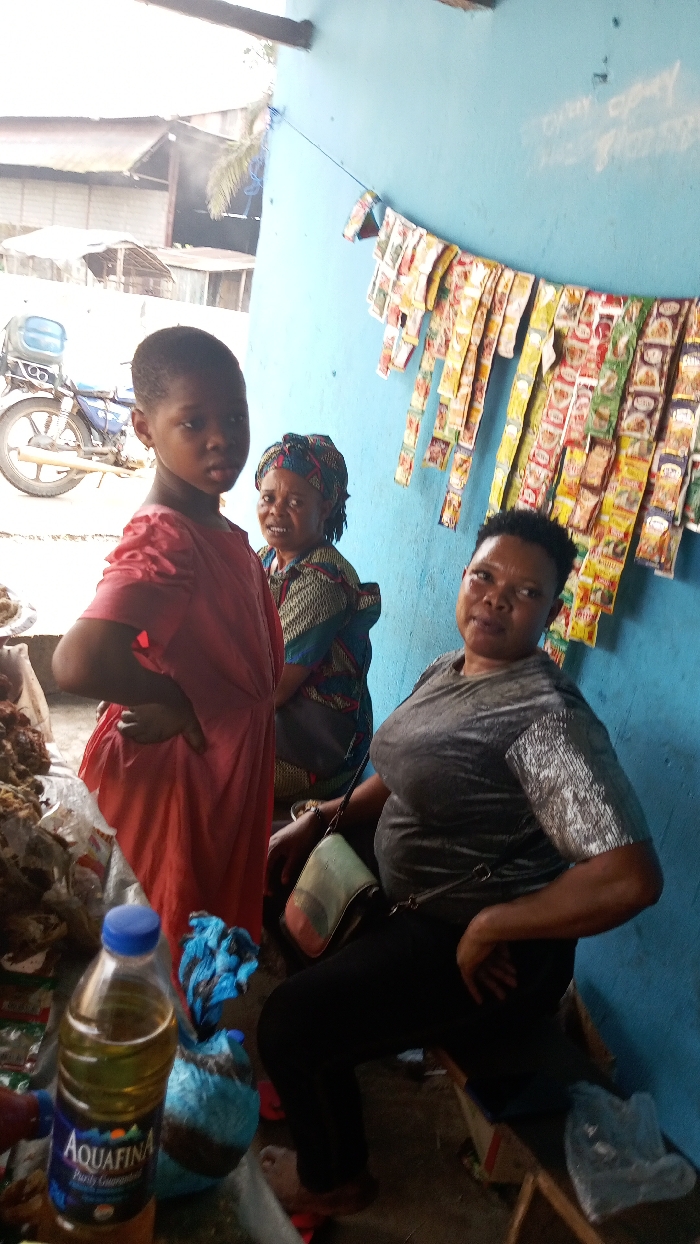 A roadside food stand features three people: a young girl in red, an older woman with a patterned head wrap, and a woman in a gray shirt sitting on a bench