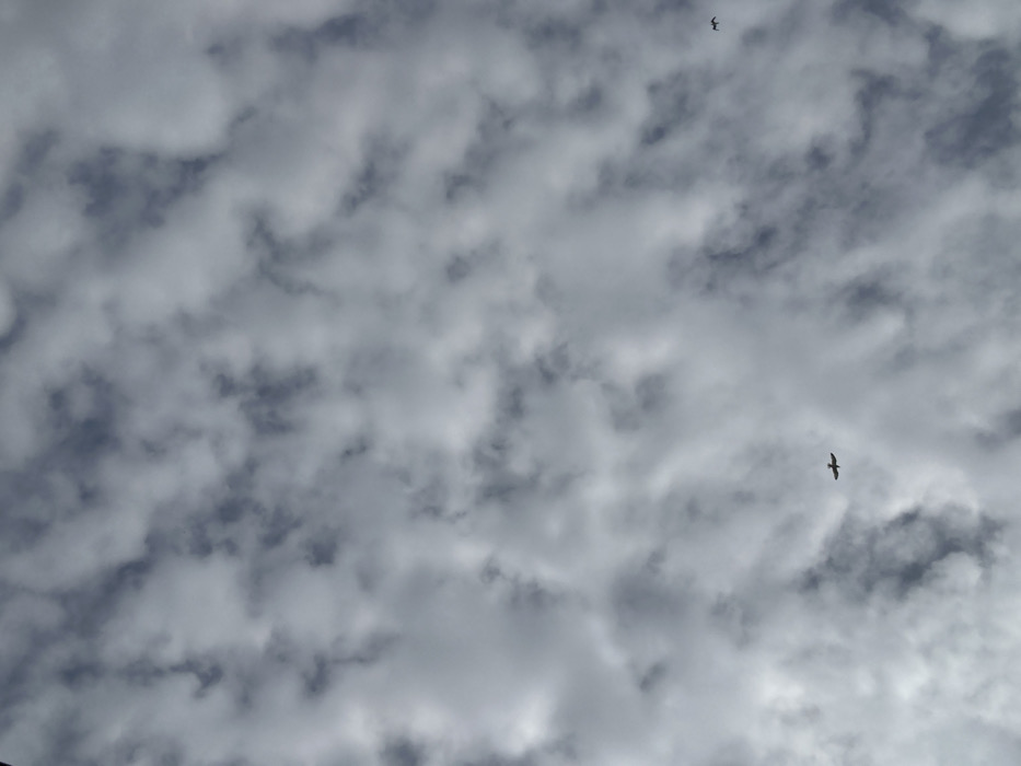 The scene depicts an overcast sky over the city of Burgas, Bulgaria. The sky is predominantly covered by a fragmented layer of altocumulus or stratocumulus clouds, appearing in shades of white and light grey with darker grey-blue areas of sky visible between cloud patches. Two birds are in flight. One larger bird, silhouetted in black, is positioned in the lower-middle-left area of the frame, with its wings extended. A second, smaller bird, also silhouetted, is visible in the upper-right quadrant, appearing further away. No other subjects, objects, people, or direct interactions are discernible within the frame.