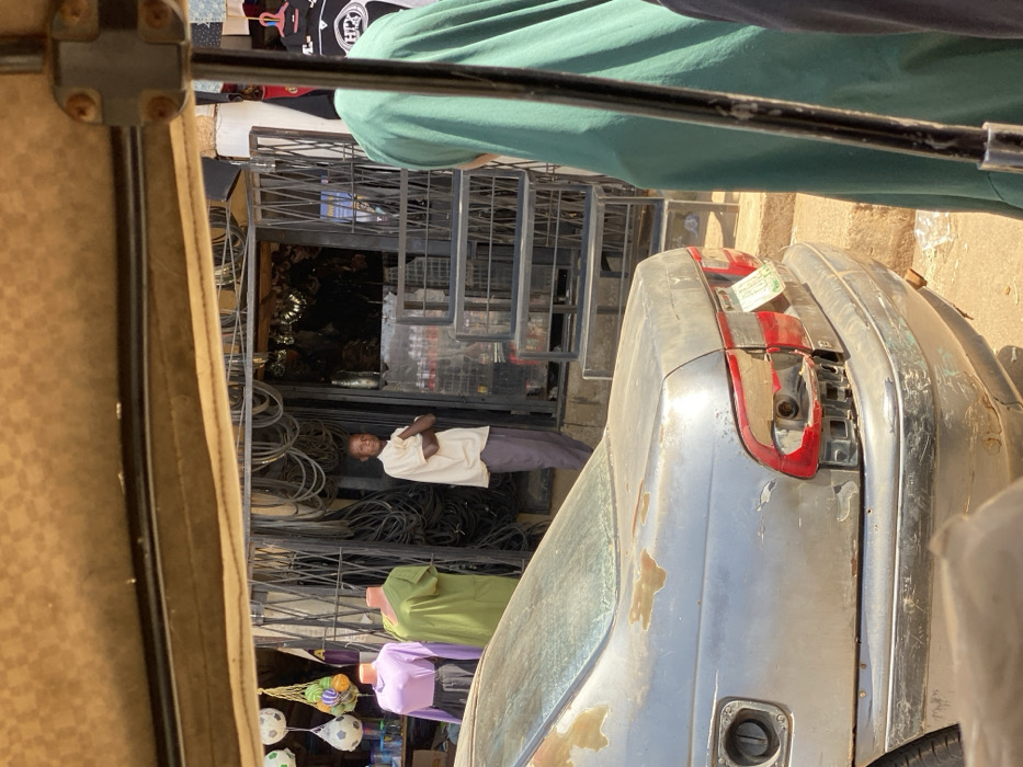 The image depicts a street scene in Bukuru, Nigeria, captured from within a vehicle. In the immediate foreground, the beige canvas roof and metal frame of the viewing vehicle are visible at the top, along with the right shoulder and green head covering of a person facing away from the camera. The midground features the rear of a heavily deteriorated silver-grey sedan. The vehicle exhibits significant paint peeling and rust spots on its trunk and roof. The fuel cap cover on the left rear fender is missing, exposing the fuel opening. The left taillight assembly is completely absent, revealing internal wiring and structural components, while the right taillight is present but appears worn. A Nigerian license plate with green characters on a white background is attached to the trunk. The rear bumper is scuffed and scratched. Behind the car, an adult male with a dark complexion stands in front of a storefront. He wears a light tan short-sleeved collared shirt and dark trousers, with his arms crossed over his chest, looking directly towards the camera. The background shows two adjacent storefronts under bright sunlight. The shop to the left of the standing man displays two headless mannequins dressed in a light purple long-sleeved top with a dark skirt, and a light green tunic. Hanging beside them are several white soccer balls and colorful knitted bags or objects. The shop directly behind the man appears to be an electrical or hardware supply store, characterized by numerous coils of black electrical cable hanging and stacked around its entrance, which is secured by a black metal gate. To the right of the standing man, in front of this shop, are several stacked metal grid shelving units. Further right, red-labeled bottles, possibly beverages, are visible on a shelf. The ground appears to be unpaved dirt.