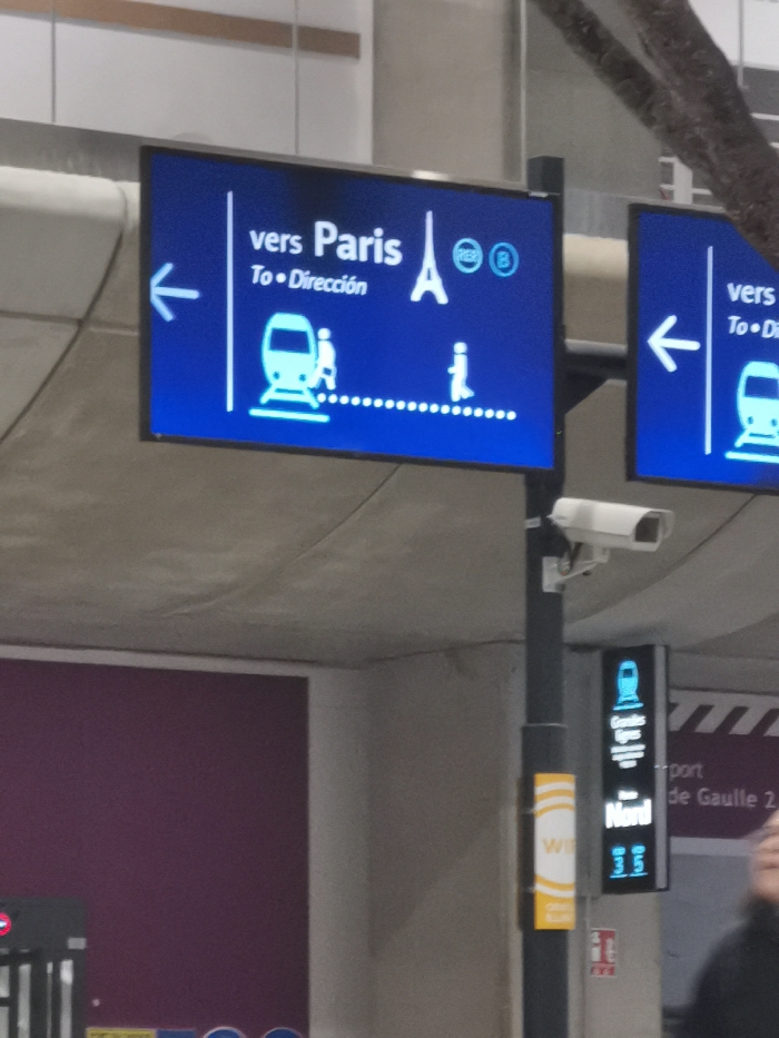 This image captures an indoor scene within a transportation hub, specifically Charles de Gaulle Airport in Tremblay-en-France, France. A prominent, illuminated blue digital sign in the upper left displays "vers Paris" (towards Paris) in French, "To • Dirección" in English and Spanish, with a white arrow pointing left. Below the text, white pictograms depict a train, a walking figure following a dotted line, the Eiffel Tower, and two circular icons labeled 'A' and 'B'. To the right, a second identical blue digital sign is partially visible, also indicating "vers Paris" and a left-pointing arrow. Both signs are mounted on a black vertical pole. A white security camera is affixed to the pole, positioned below the main signs and angled slightly towards the right. Further down the pole, a smaller vertical digital sign displays "Gaulle Express" and "Nord" with train pictograms and numerical information, alongside a yellow and white vertical strip. The environment features a light grey concrete ceiling. A solid dark magenta wall is visible on the left, and a lighter grey wall on the right. In the lower right corner, a blurred upper portion of a person's head and shoulder is discernable. The primary action indicated is direction toward Paris via train and walking.
