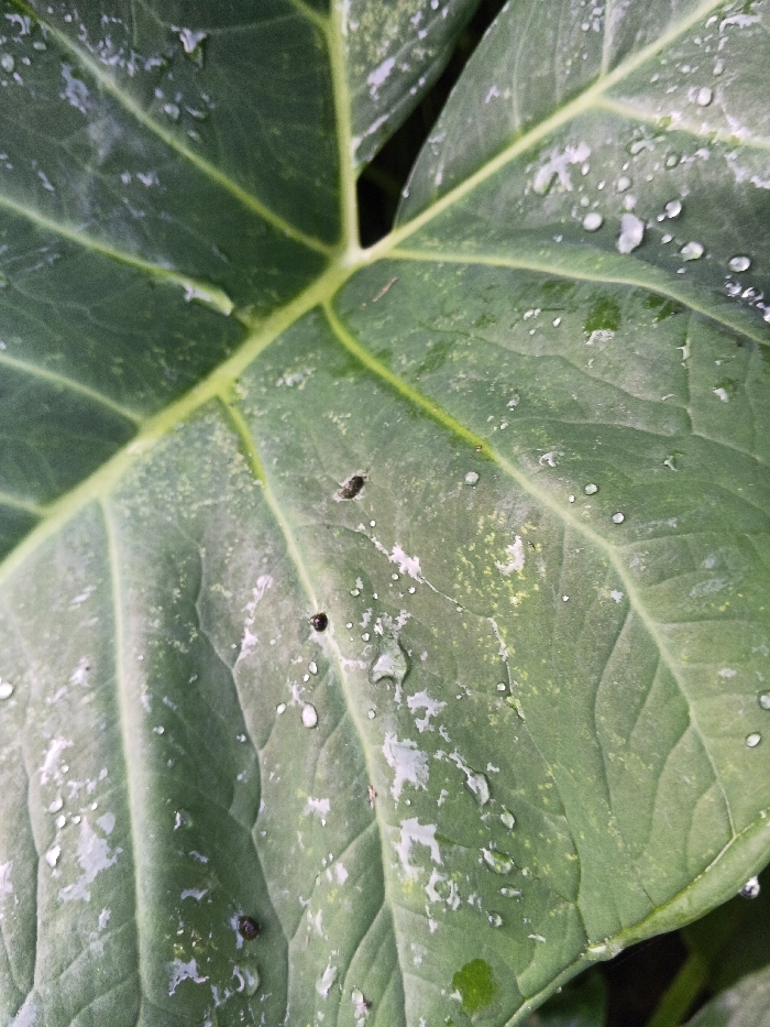 A close-up shot reveals a vibrant green taro leaf adorned with scattered water droplets and three tiny, dark-colored beetles. The leaf displays a network of prominent veins, with a lighter yellowish-green hue delineating them. The leaf's surface exhibits a mottled pattern, with patches of lighter discoloration amidst the dominant green. The overall texture appears smooth and slightly glossy, emphasized by the water droplets.