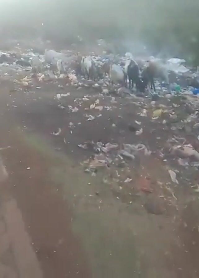 group of goats scavenging through a large pile of garbage. The garbage includes plastic bags, bottles, and other discarded items. There is smoke rising from a burning area in the distance. The camera pans across the scene, showing the goats moving through the trash and feeding on what they can find. The environment appears to be a roadside area with dirt and some vegetation nearby.
