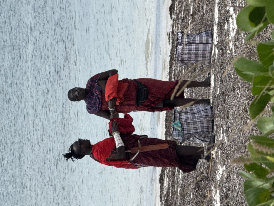 This image captures a beach scene in Zanzibár, Tanzania. Two dark-skinned individuals, appearing male, stand on a debris-covered sandy beach facing each other, with calm ocean water in the background. The individual on the left wears a dark red lower garment and a bright red shawl draped over the shoulders and chest, leaving the right arm exposed. This person has hair styled in a topknot, wears dark sunglasses, and has a multi-banded, possibly beaded, cuff on the right forearm. A sheathed, dark-handled blade, appearing to be a short sword or large knife, hangs from a belt on the left hip. This individual holds a folded red fabric item in the left hand and gestures towards the second person. The individual on the right wears a dark red garment wrapped around the lower body and a patterned blue, red, and white shawl draped over the shoulders and chest. This person also wears dark sunglasses or eyeglasses and a black fanny pack or waist bag around the waist. A folded red fabric item is held in both hands at chest level. On the ground near their feet are two large, rectangular, plaid-patterned woven tote bags in shades of grey, white, and black. A light blue item is visible inside the left bag. The beach surface is predominantly covered with a dense layer of dark brown organic matter, likely seaweed or seagrass debris. The background consists of light blue ocean water with minimal surface disturbance. In the immediate foreground, out-of-focus green foliage is visible.