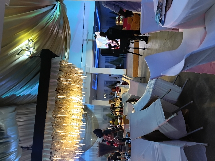 An indoor wedding reception is in progress, featuring tables adorned with white tablecloths and chairs draped with white covers. A cameraman is filming the event. The venue has a decorated stage with a cascading display of flowers and lights. The scene is illuminated by soft lighting, creating an elegant and celebratory atmosphere.