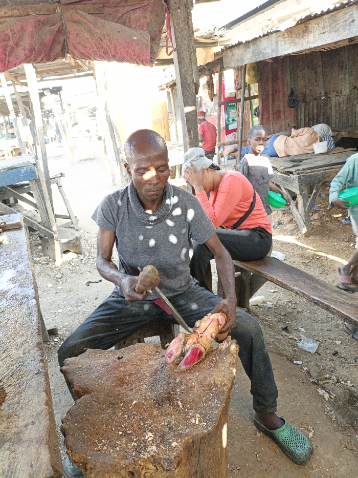 An outdoor market scene in Kofar Mazugal, Nigeria, is depicted under bright daylight. In the foreground, a dark-skinned adult male with short hair, wearing a grey short-sleeved top and dark trousers, is seated on a low stool. He is engaged in butchery, using a wooden mallet held in his right hand to strike a metal cleaver positioned in his left hand against a large animal limb. The limb, appearing to be a hoofed foot with prominent red-tipped hooves, rests on a substantial, weathered wooden chopping block, which exhibits blood residue and wood shavings. The man's feet are clad in green plastic clogs. To the right of the central figure, a woman wearing an orange long-sleeved top and a light-colored head covering sits on a wooden bench, leaning forward with her left hand touching her forehead. Adjacent to her, a young boy in a dark grey t-shirt stands, holding a bright green bowl or container. A partial view of another individual holding a similar green bowl is visible further to the right. The background reveals a bustling market environment with rudimentary structures. These include stalls constructed from wooden posts, corrugated metal sheets, and makeshift fabric awnings, notably a reddish fabric canopy in the upper left. A person is observed lying on a raised wooden surface within one of the corrugated metal structures. The ground throughout the scene is bare earth.