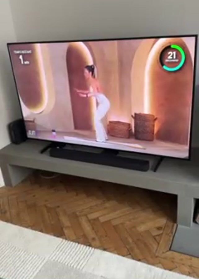 The camera is pointed at a large TV on a gray table. The TV is showing a woman in a white outfit doing squats. There are two brown decorative baskets to the right of the woman. There is a timer at the top of the screen. The TV table also has a black speaker bar underneath the screen. To the left of the TV is a black speaker. The floor is wood, and there is a large beige and white rug in front of the table. A person is standing in the bottom left of the shot.