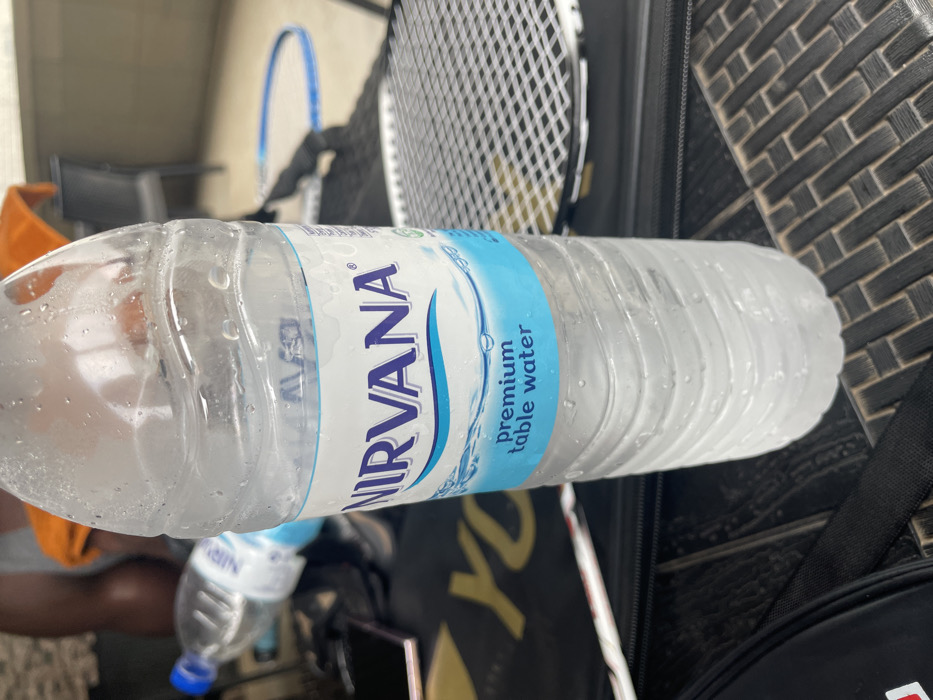 A clear plastic bottle of "NIRVANA premium table water," exhibiting visible condensation, stands upright on a dark, woven surface. The bottle is partially full. To the left, a second, blue-capped "NIRVANA" water bottle lies horizontally on a black bag that displays a partial yellow logo, possibly "YO" or "YONEX." A dark-colored smartphone with a light screen edge rests on this bag, adjacent to a red and white striped straw. To the right of the main bottle, a blue and white strung tennis or badminton racket is visible, also resting on a dark surface or bag. In the blurred background to the left, the lower torso and legs of an individual with dark skin are discernible, partially obscured by an orange fabric. The right background features an outdoor setting with a dark chair and a light-colored wall or railing. The scene is illuminated by natural light, occurring in Idimu, Nigeria.