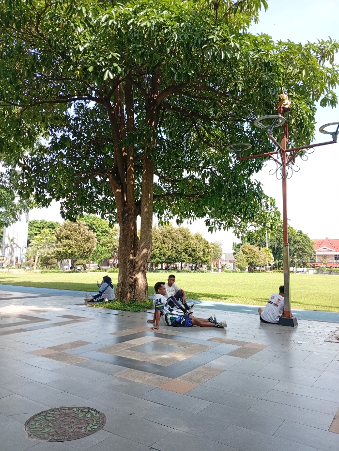 A sunny outdoor scene shows a park with a large, leafy tree providing shade. Four individuals are relaxing in the shade on a paved area with a patterned tile design. A woman sits further back, while three men are closer, one leaning against the tree trunk and another lying down. In the background, a grassy field stretches out towards buildings and trees, and an ornate lamppost stands nearby. A manhole cover is visible in the foreground.