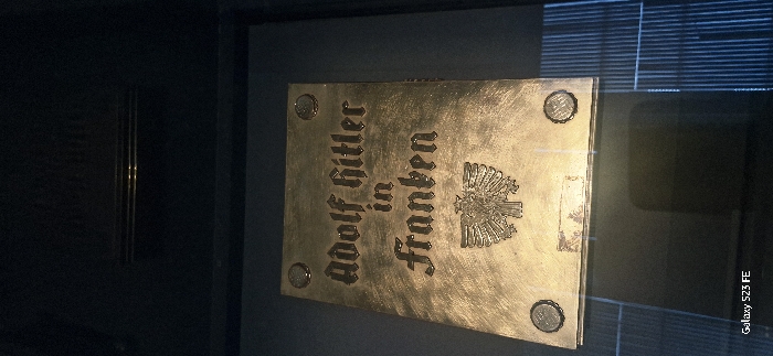 An angled photograph depicts a gold-colored rectangular object, likely a plaque or book cover, displayed horizontally within a dark, reflective enclosure. The object's surface bears embossed text in German Gothic script: "Adolf Hitler in Franken." Below the text, a relief of an eagle emblem, consistent with the German Reichsadler (Imperial Eagle) from the Nazi era, is present. Four circular, ornate studs or fasteners are visible at the corners of the object. Reflections are apparent on the object's surface and the surrounding display case, indicating it is under protective viewing conditions in a low-light environment. The specific location is the Louvre-Lens Museum in Lens, France, where the object is part of a historical exhibition. No individuals are visible.