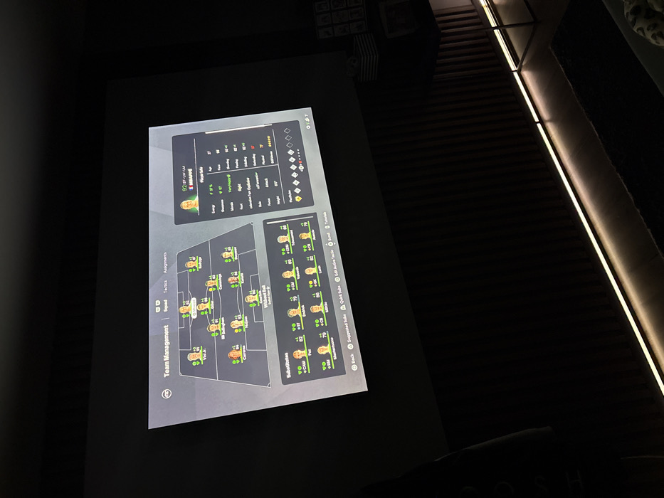 The image displays a dimly lit indoor scene, primarily illuminated by a large projected screen on a dark wall. The screen exhibits the "Team Management" interface of a football simulation video game, likely EA Sports FC or FIFA, depicting a squad formation and player details. The on-screen formation shows eleven primary players, including Vinicius Jr., Bellingham, Courtois, Rodrygo, and a detailed "Player Info" panel for Kylian Mbappé (rated 92 ST-LW-LM), displaying his attributes like energy (F 97%), sharpness (Very Happy), morale, foot (Right), age (27), height (5'11"), and various skill statistics (e.g., pace 98, shooting 92+4, passing 82+6). Below the main formation, a "Substitutes" section lists additional players such as Martínez, Militão, Endrick, Tchouaméni, Valverde, Lunin, and Asensio. Interactive options like "Back," "Suggested Subs," "Quick Subs," "Edit Active Tactic," and "Tutorials" are visible at the bottom of the screen interface. The room features a dark, vertically ribbed or slatted wall paneling directly beneath the projection. A horizontal strip of warm, ambient LED lighting runs along the base of this paneling, casting a soft glow onto a dark floor covering, possibly a rug or carpet, which rests on a lighter floor surface. To the far right, a dark, minimalist side table or shelf unit holds several stacked items, including what appear to be books or small boxes, and possibly framed photographs. A dark, indistinct object, potentially a person's shoulder or a piece of furniture, is partially visible on the left edge of the frame. The visual evidence provided in the image does not contain any discernable features, such as identifiable landmarks, distinctive architecture, unique local objects, or textual information, to determine the specific location within the city of Pernik, Bulgaria, or even the country itself. The scene depicts a generic modern indoor entertainment setup.