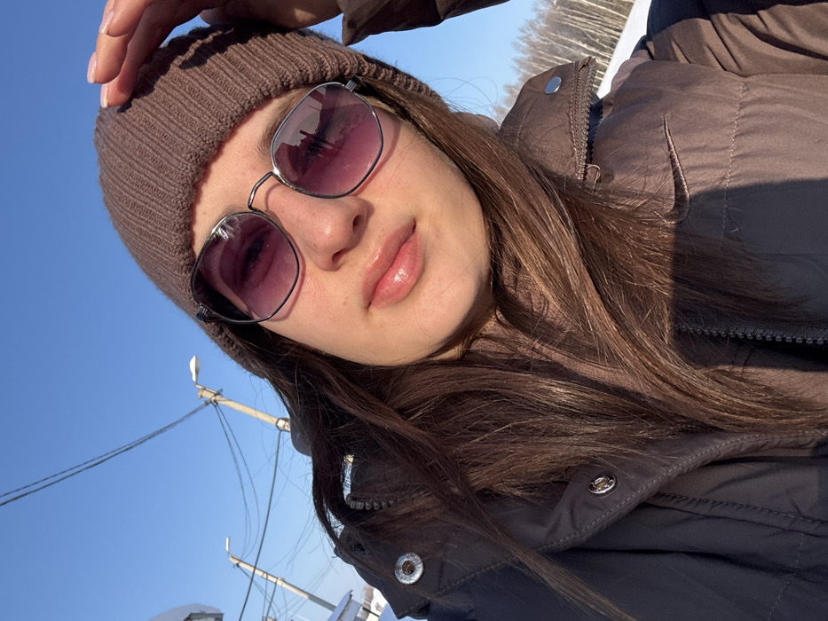 A woman wearing a brown beanie and sunglasses looks up at the camera. She is wearing a brown puffer jacket. Clear blue sky is visible in the background along with trees and a snow-covered ground. Electrical poles and wires are also visible against the blue sky.