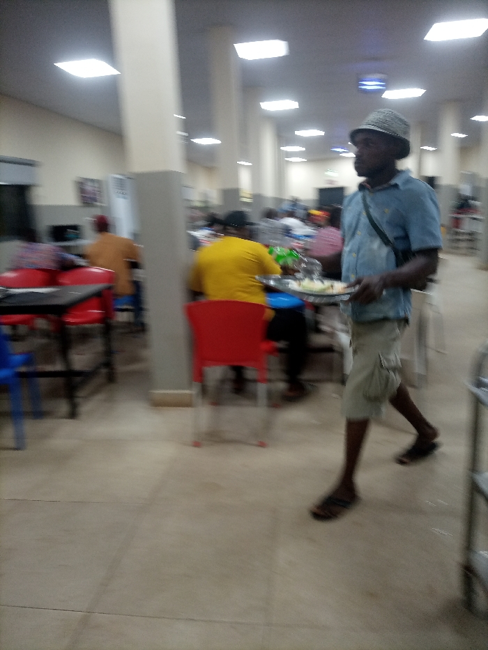 Inside a bustling canteen, a man in a hat, light blue shirt, and cargo shorts carries a tray of food. The room is filled with people seated at tables, many with red chairs. Overhead, bright square lights illuminate the scene. The man is captured in motion, suggesting a lively atmosphere. Pillars are seen throughout the space. The floor is composed of large, light-colored tiles.