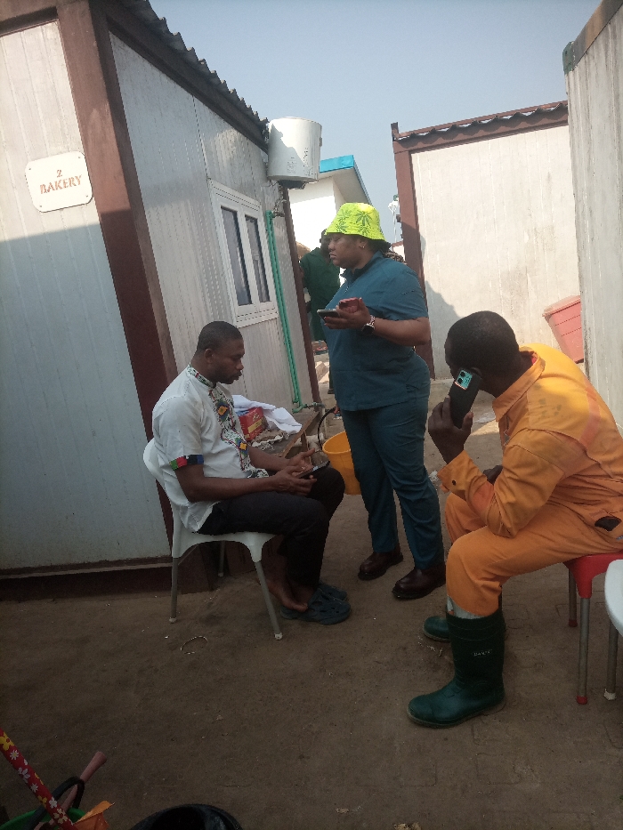 The image depicts an outdoor scene in the city of Opete, Nigeria, between modular-style buildings under a clear sky. Three individuals are present. On the left, a male in a white short-sleeved shirt with colorful patterns on the collar and cuffs, and dark trousers, is seated on a white plastic chair. He wears dark blue/green clogs and is actively looking at a smartphone held in both hands. In the center, a female wearing a yellow bucket hat with green leaf patterns, a teal short-sleeved top, and matching trousers stands, holding a smartphone in her left hand and a small red object in her right. She wears dark brown shoes. On the right, a male in an orange long-sleeved jumpsuit is seated on a small red stool, holding a black smartphone to his right ear, seemingly engaged in a call. He wears dark green, knee-high rubber boots. The building immediately to the left is a white modular structure with brown trim, featuring a sign that reads "2 BAKERY". A white bucket is mounted on this building's wall, connected to a green pipe. A yellow plastic bucket rests on the ground near the standing female's feet. The ground surface appears to be a light brown, possibly packed dirt or concrete.