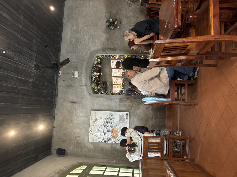 The interior of a cafe shows customers seated at wooden tables and chairs. A man in black and a woman are conversing, while another man in a light jacket sits nearby. A couple seated closer to the camera appears to be kissing. A large drawing of donuts hangs on the wall, near a window. A ceiling fan is visible, and festive decorations surround an arched doorway.