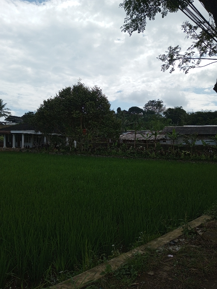 The image displays an outdoor scene in Ariyalai, Sri Lanka, featuring a lush green rice paddy field that occupies the majority of the foreground. Beyond the paddy, in the middle ground, a white single-story house with a dark roof and prominent white columns on a porch is visible to the left. A large, densely foliated tree stands centrally behind the paddy, with a small, dark object suspended from one of its branches. To the right of this tree, several other structures with dark roofs, appearing to be residential or auxiliary buildings, are partially obscured by vegetation. A line of smaller trees and shrubs forms a border between the paddy field and these structures. The background consists of a dense treeline extending towards a subtle elevation. The sky above is largely overcast with white and grey clouds. No individuals are present, and no specific actions or interactions are depicted. A concrete edge with sparse ground cover is visible at the lower right corner, adjacent to the rice field.