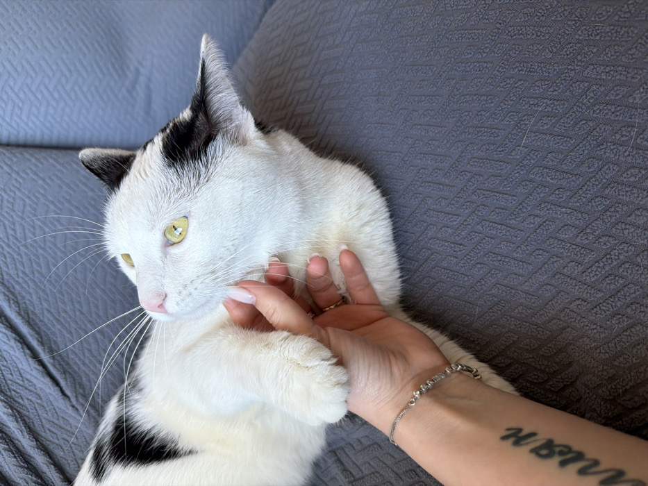 - "The image displays an indoor scene in The Hague, Netherlands, focusing on a domestic cat and a human hand interacting" by FM-KRhrh2, licensed under CC BY 4.0