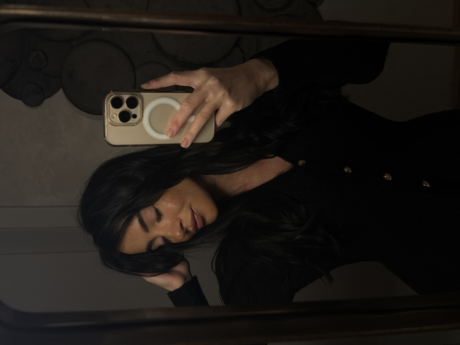 The scene depicts a female individual, observed through a mirror's reflection, in an indoor setting within the city of Krasnoyarsk, Russia. The subject, positioned centrally, is a woman with long, dark, wavy hair and a dark complexion, appearing to be in the process of taking a self-portrait. She is holding a light-colored smartphone with a prominent multi-lens camera array and a white MagSafe ring in her right hand, directed towards the mirror. Her left hand is raised, lightly touching the dark hair near the left side of her head. Her eyes are closed, or cast downwards, and her lips are slightly parted, conveying a relaxed or contemplative expression. She is wearing a dark, V-neck garment, possibly a cardigan or top, adorned with several small, round golden buttons vertically down the front. The immediate environment, visible as a reflection behind the subject, features a plain, dark-grey wall with a subtle texture or relief sculpture composed of several interlocking or overlapping circular and organic shapes. The lighting is dim, suggesting an intimate or low-light ambiance. The mirror itself has a dark, thin frame, visible along the edges of the image. No specific identifying landmarks of Krasnoyarsk are visible within the frame to confirm the exact location beyond an indoor, private-like space.