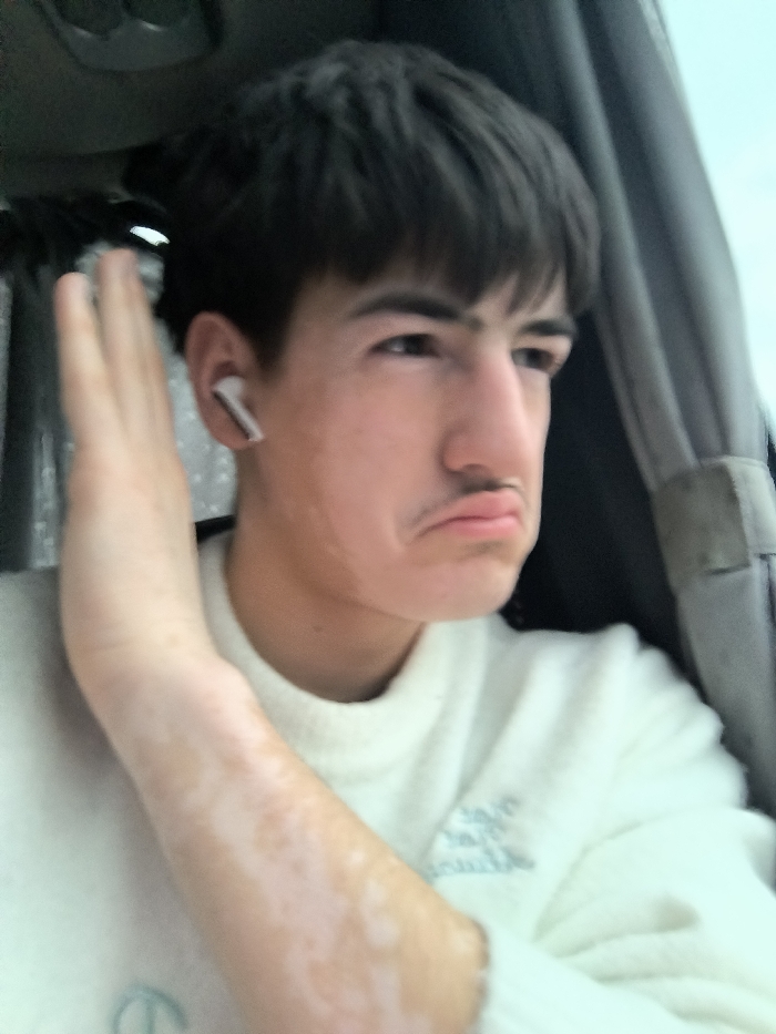 The image depicts a young male subject inside a vehicle in Mlada Gvardia, Bulgaria. The subject has short, dark hair with a fringe and appears to be a teenager or young adult. He wears a light-colored, possibly cream, long-sleeved sweater with a subtle light blue or grey embroidery on the right chest. A white wireless earbud is present in his left ear. His left forearm, visible in the foreground, exhibits distinct patches of hypopigmented skin. The subject's face is turned slightly to his right, with eyes directed off-camera. His lips are pursed into a pout, and a thin, dark mustache is visibly drawn above his upper lip. His eyebrows are dark and prominent. His left hand is raised vertically next to his left temple, palm facing the viewer. The background on the left consists of a dark vehicle interior component, while the right side shows a blurred exterior view through a window, revealing a light blue sky and a dark interior trim piece.