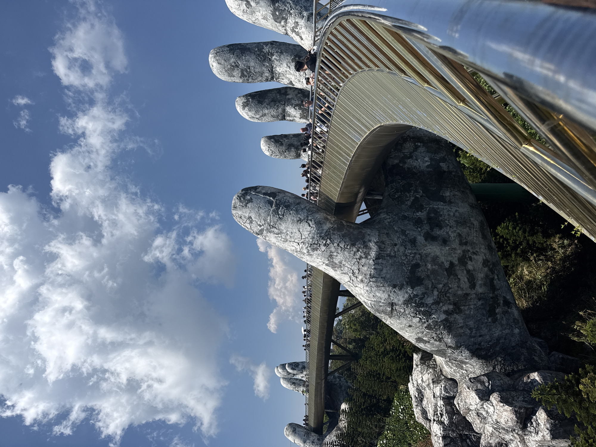 Golden Bridge in the Bà Nà Hills resort, Đà Nẵng, Vietnam. The bridge is supported by two giant stone hands. There are many people on the bridge. The sky is blue with scattered clouds. The surrounding area has some vegetation and rock formations. A metallic, semi-circular structure is to the right of the bridge.