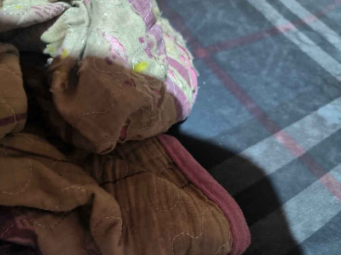 - "close-up of a brown and pink quilted blanket with a torn hole" by FM-AI19E2, licensed under CC BY 4.0