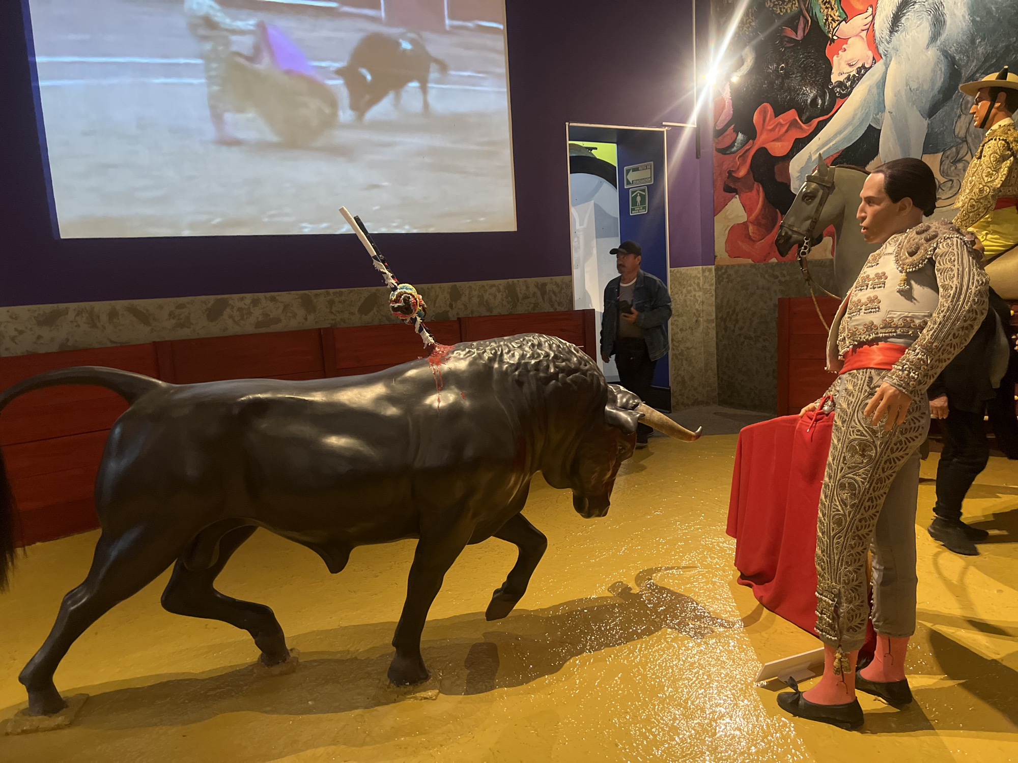 The image depicts a scene with a bullfighting theme, potentially from a museum or exhibition. In the foreground, there is a life-size statue of a bull, pierced with banderillas, a type of decorative dart. Next to it stands a mannequin dressed as a matador, holding a red cape. In the background, there is a screen displaying a bullfighting scene and a painting. A man stands in a doorway in the background. The scene is set on a yellow floor resembling the sand of a bullfighting arena. The location appears to be in Unknown, Unknown.