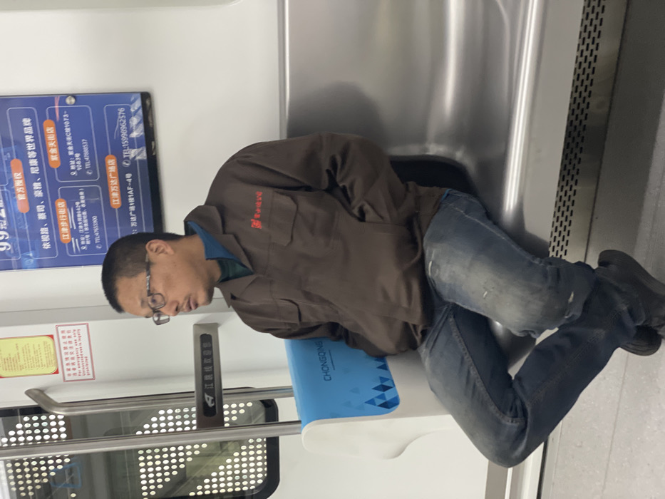 A man in glasses, a brown jacket, and jeans is sleeping on a subway seat. He is leaning against the side of the train. A blue cushion with "CHONGQING" printed on it is positioned under his head. A subway advertisement is visible on the wall, listing brands like "依视路 (Essilor)," "蔡司 (Zeiss)," "豪雅 (Hoya)," and "尼康 (Nikon)," as well as addresses and phone numbers for stores in Chongqing, China.