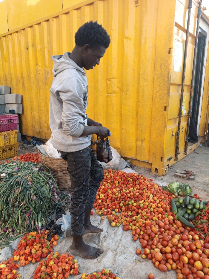 A young man stands barefoot at an outdoor market, holding a dark plastic bag. He wears a gray hoodie and patterned black jeans. Piles of tomatoes, onions, cucumbers, and peppers surround him, spread out on a white sheet. A woven basket sits amidst the produce. Behind the man is a large, yellow shipping container. A pair of sandals rests on the container's ledge.