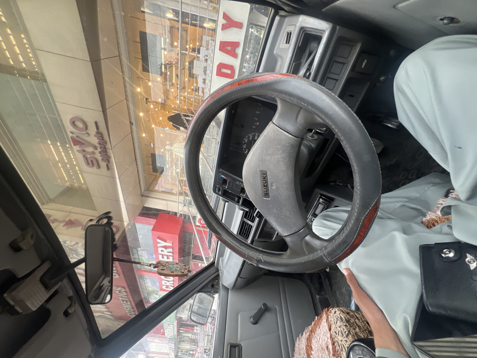 The image displays a view from the interior of a stationary Suzuki vehicle, looking outward onto a commercial street in Mansehra, Pakistan