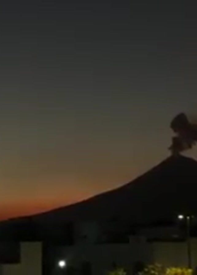 distant volcano erupting at night or early morning, with a dark plume rising from its peak